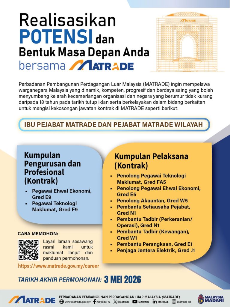 Perbadanan Pembangunan Perdagangan Luar Malaysia (MATRADE) membuka peluang kerjaya kepada warganegara Malaysia bagi tahun 2026 melalui pengambilan pelbagai jawatan kontrak. Pengambilan ini melibatkan kategori pengurusan dan profesional serta kumpulan pelaksana.