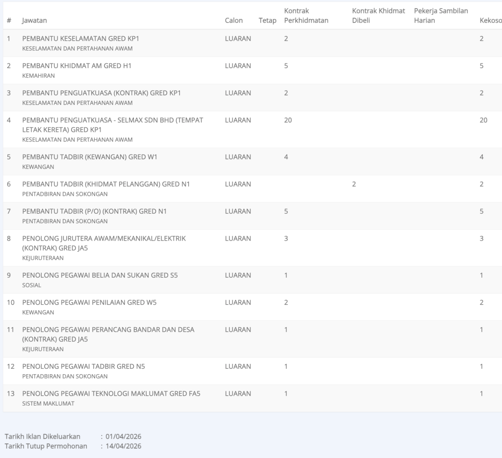 Jawatan seperti penguatkuasa dan pembantu khidmat am mempunyai kekosongan lebih tinggi, menjadikan peluang diterima lebih besar bagi calon yang layak.