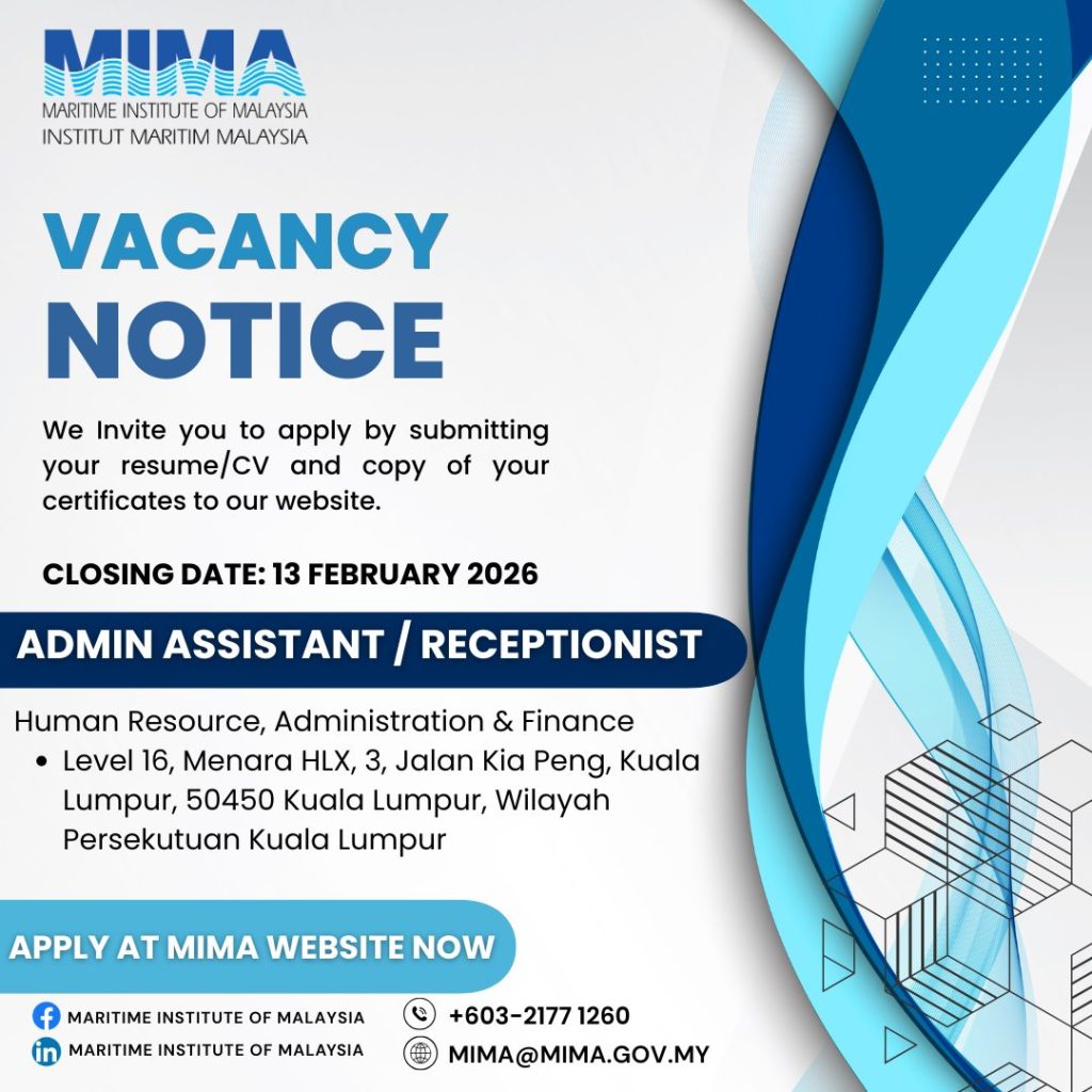Berita baik untuk pencari kerja dalam bidang pentadbiran dan perkeranian. Maritime Institute of Malaysia (MIMA) kini membuka peluang kerjaya bagi jawatan Admin Assistant / Receptionist untuk penempatan di Kuala Lumpur.