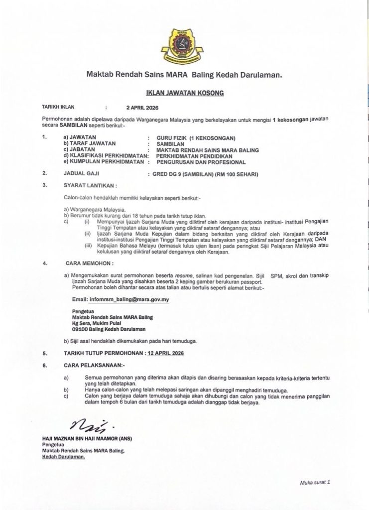 Permohonan jawatan kosong terkini di Maktab Rendah Sains MARA (MRSM) Baling Kedah kini dibuka bagi tahun 2026. Peluang ini terbuka kepada warganegara Malaysia yang berkelayakan dalam bidang Fizik atau pendidikan.
