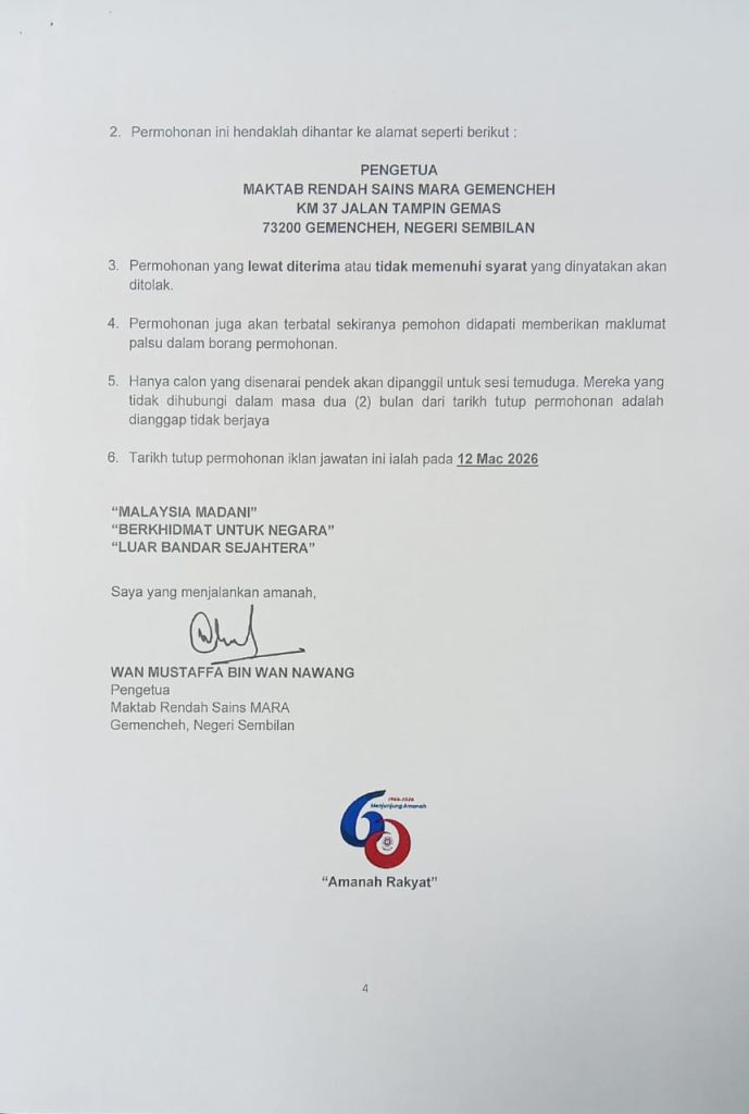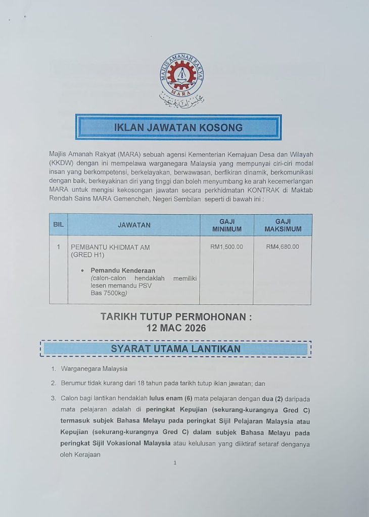 Majlis Amanah Rakyat (MARA) mempelawa Warganegara Malaysia yang berkelayakan untuk mengisi kekosongan jawatan kontrak di Maktab Rendah Sains MARA (MRSM) Gemencheh, Negeri Sembilan bagi tahun 2026.