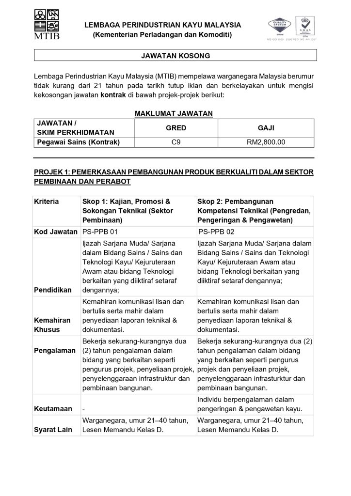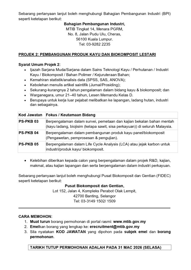 Industri kayu dan biokomposit negara kini semakin berkembang selari dengan agenda kelestarian dan pembangunan teknologi hijau Malaysia. Sehubungan itu, Lembaga Perindustrian Kayu Malaysia (MTIB) di bawah Kementerian Perladangan dan Komoditi membuka peluang kerjaya kepada warganegara Malaysia yang berkelayakan bagi mengisi jawatan kontrak sebagai Pegawai Sains Gred C9.