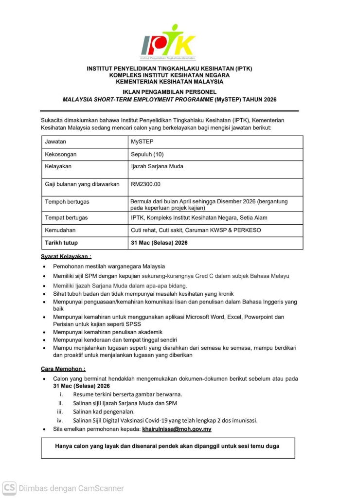 Jika anda seorang graduan yang sedang mencari pengalaman kerja dalam sektor kesihatan atau penyelidikan, ini adalah peluang yang tidak wajar dilepaskan. Institut Penyelidikan Tingkahlaku Kesihatan (IPTK) di bawah Kementerian Kesihatan Malaysia kini membuka pengambilan bagi program Malaysia Short-Term Employment Programme (MySTEP) bagi tahun 2026.
