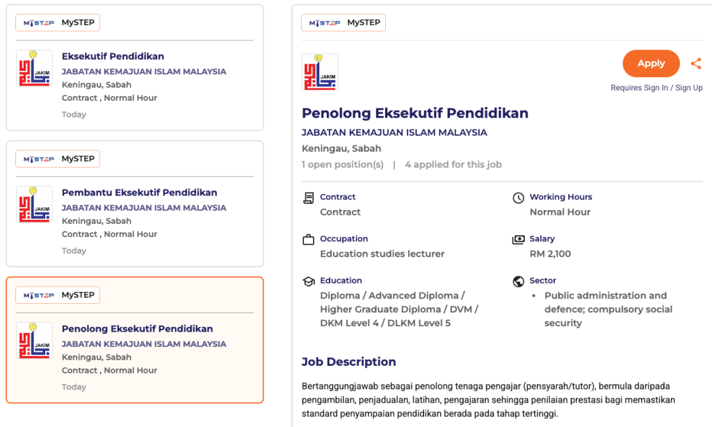 Permohonan perlu dibuat melalui portal rasmi: https://candidates.myfuturejobs.gov.my/
