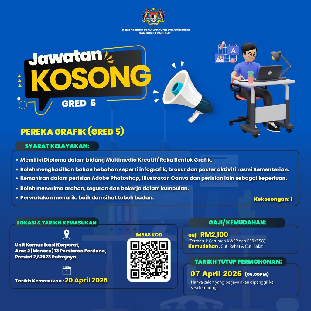 Kementerian Perdagangan Dalam Negeri dan Kos Sara Hidup (KPDN) kini membuka peluang kerjaya kepada individu kreatif untuk mengisi jawatan Pereka Grafik & Multimedia di bawah lantikan Personel MySTEP (Gred S5).