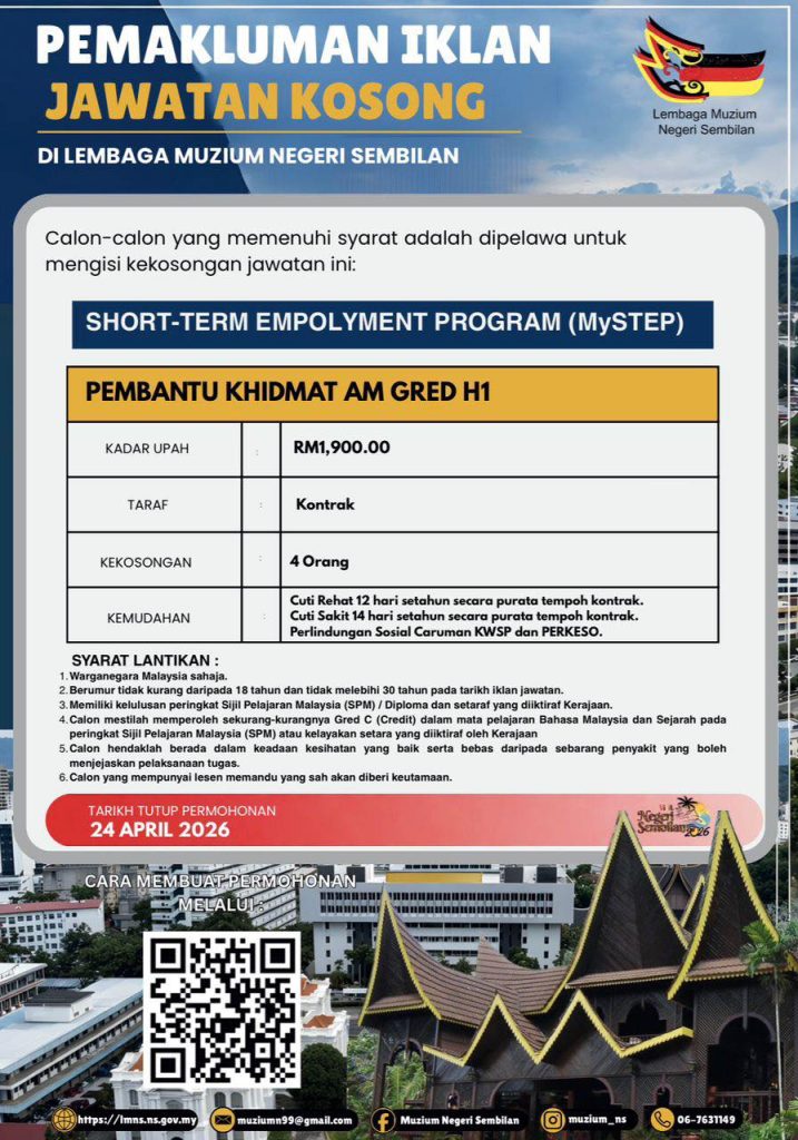 Lembaga Muzium Negeri Sembilan (LMNS) kini mempelawa calon berkelayakan untuk mengisi kekosongan sebagai Pembantu Khidmat Am Gred H1.