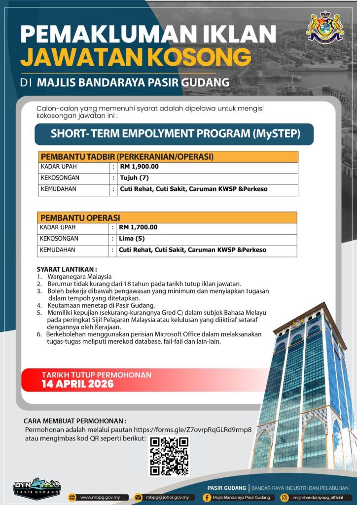 Majlis Bandaraya Pasir Gudang (MBPG) kini membuka peluang pekerjaan melalui program MySTEP (Short-Term Employment Program) bagi tahun 2026. Pengambilan ini melibatkan beberapa jawatan penting yang sesuai untuk lepasan SPM dan individu yang ingin memulakan kerjaya dalam sektor kerajaan.