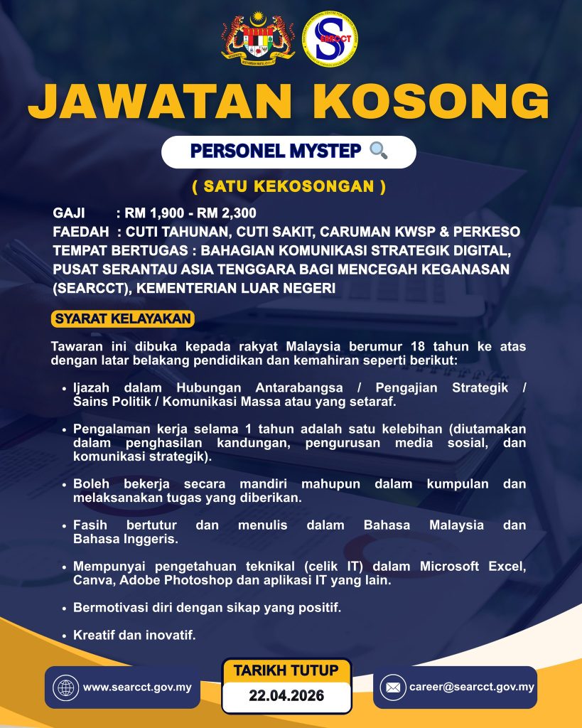 Pusat Serantau Asia Tenggara bagi Mencegah Keganasan (SEARCCT) di bawah Kementerian Luar Negeri kini membuka pengambilan bagi jawatan Personel MySTEP tahun 2026. Peluang ini sangat sesuai kepada graduan dalam bidang komunikasi, media dan hubungan antarabangsa yang ingin membina kerjaya dalam sektor kerajaan.