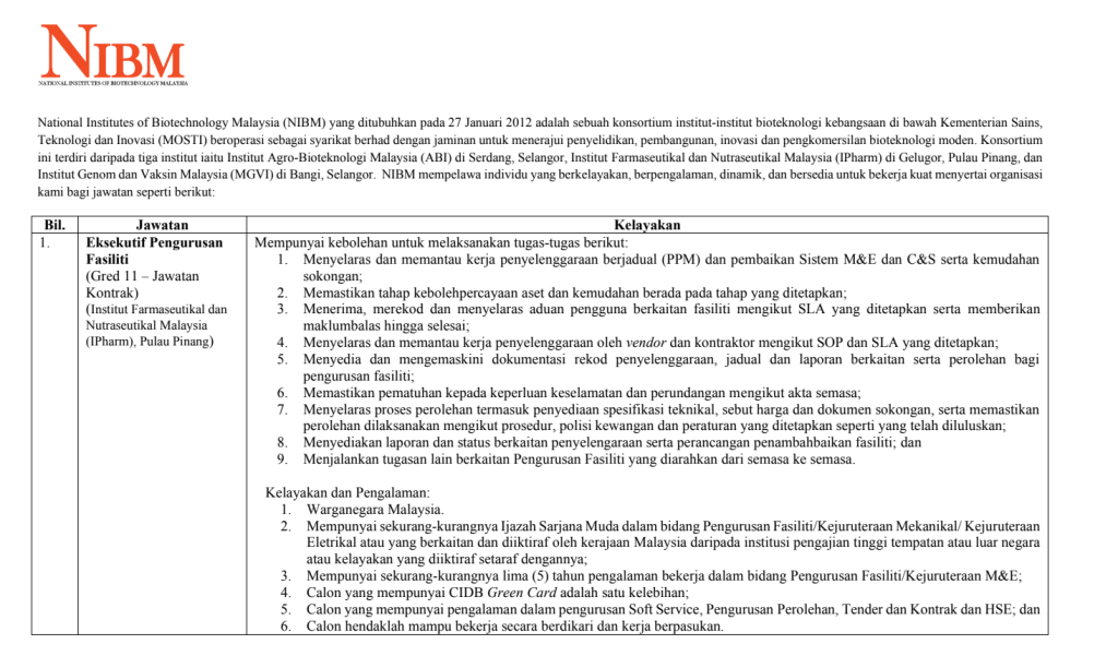 National Institutes of Biotechnology Malaysia (NIBM) kini membuka peluang kerjaya kepada calon berpengalaman untuk mengisi kekosongan jawatan Eksekutif Pengurusan Fasiliti Gred 11 (Jawatan Kontrak) di Institut Farmaseutikal dan Nutraceutical Malaysia (IPharm), Pulau Pinang.
