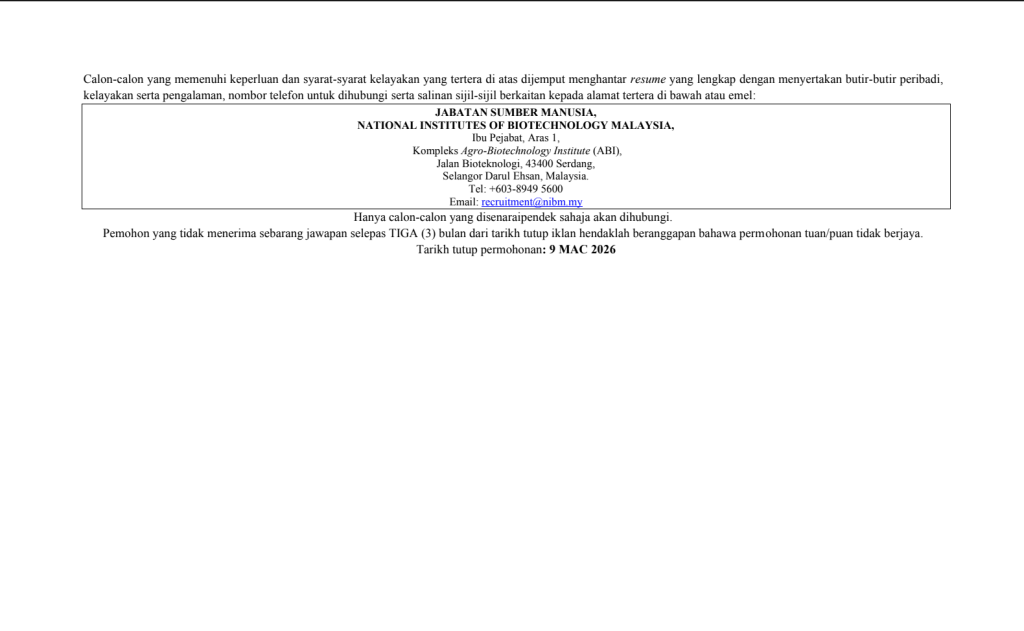 Jawatan Eksekutif Pengurusan Fasiliti Gred 11 di NIBM merupakan peluang kerjaya yang sesuai untuk profesional berpengalaman yang ingin berkhidmat dalam sektor penyelidikan bioteknologi negara. Dengan skop tugas yang mencabar serta keperluan teknikal yang tinggi, jawatan ini bukan untuk graduan baharu, tetapi untuk calon yang benar-benar bersedia dari segi pengalaman dan kemahiran.