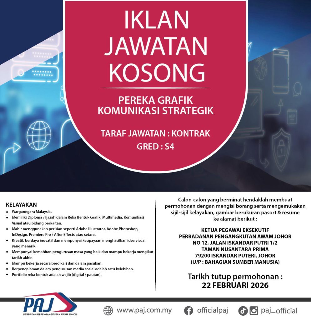 Perbadanan Pengangkutan Awam Johor (PAJ) kini membuka beberapa jawatan kontrak melibatkan bidang grafik, pentadbiran, operasi, pembangunan perniagaan dan kewangan di Iskandar Puteri. Pengambilan ini bertujuan mengisi keperluan organisasi dalam menyokong pengurusan serta pembangunan sistem pengangkutan awam negeri Johor.