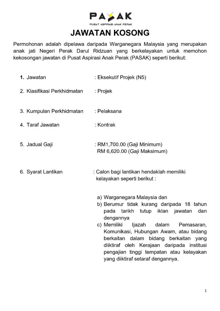 Pusat Aspirasi Anak Perak (PASAK) membuka peluang pekerjaan bagi mengisi jawatan Eksekutif Projek (N5) di bawah klasifikasi projek.