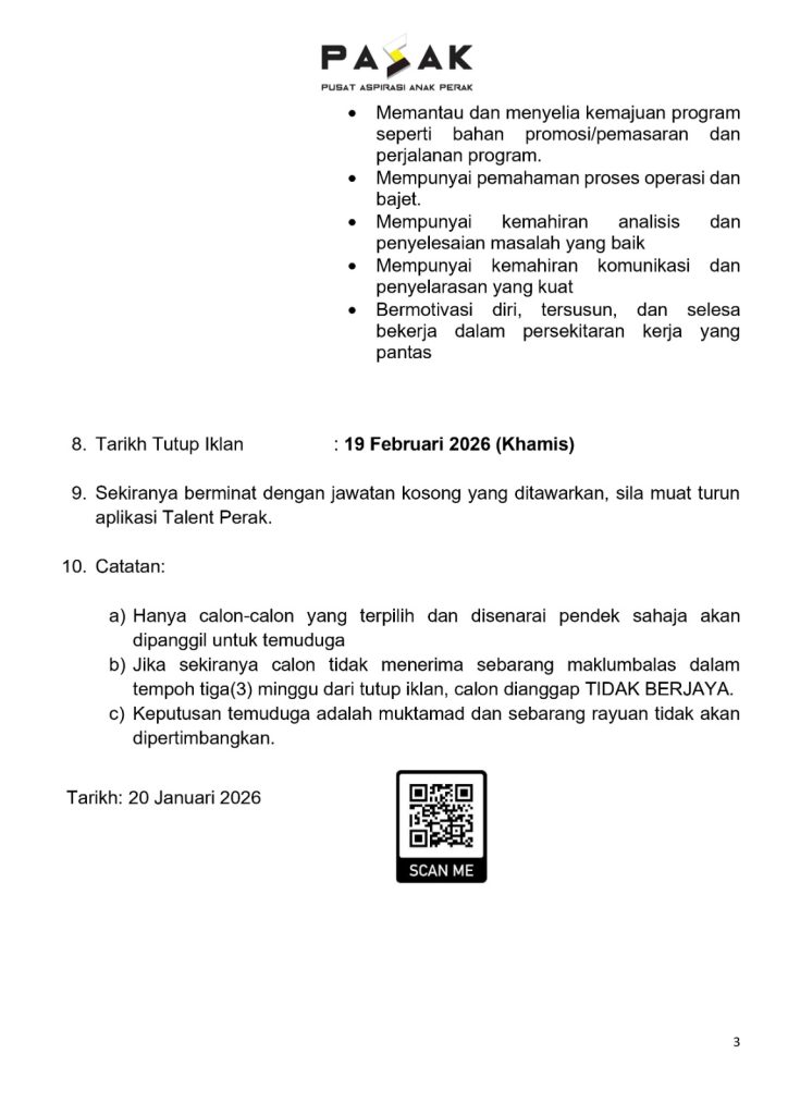 β³ Mohon segera sebelum 19 Februari 2026 melalui aplikasi Talent Perak.