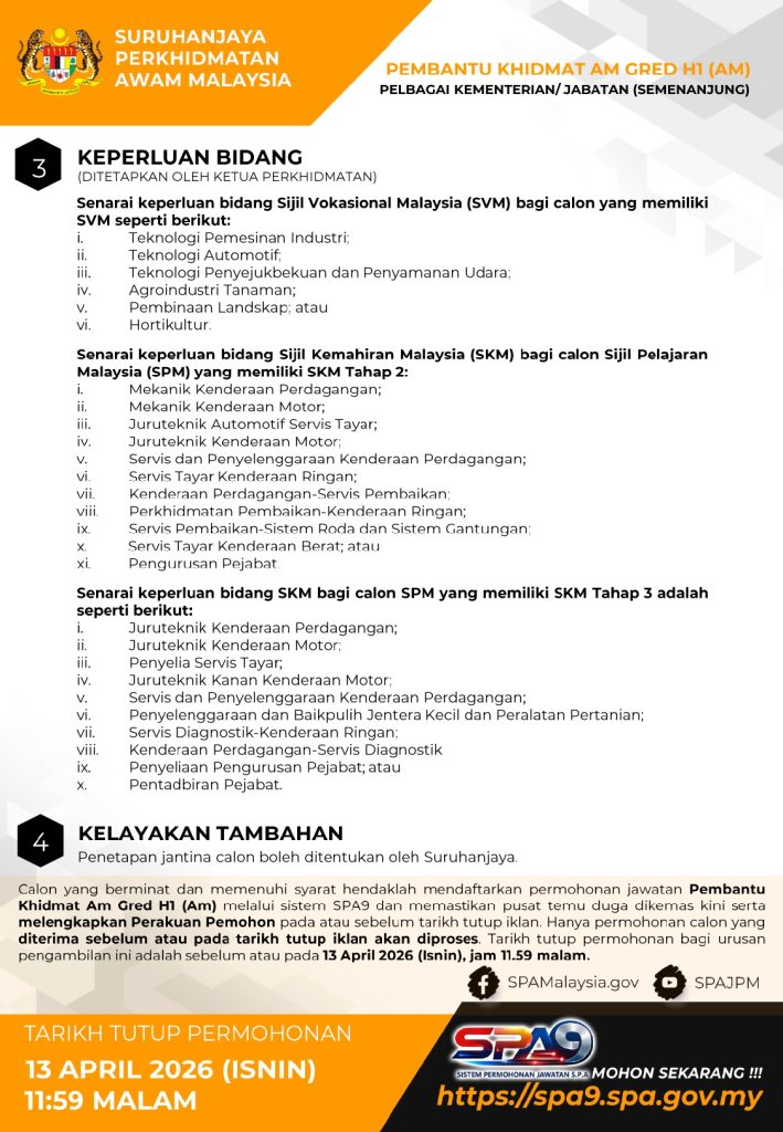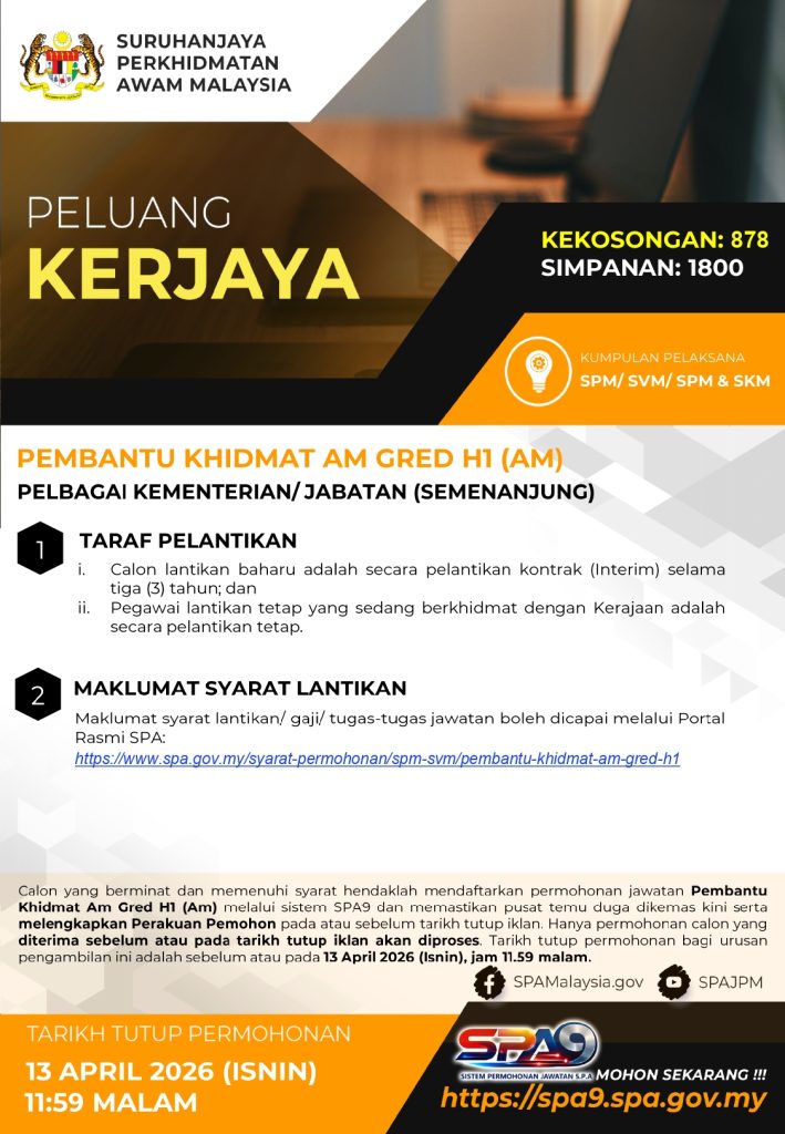 Permohonan jawatan Pembantu Khidmat Am Gred H1 (AM) kini dibuka melalui Suruhanjaya Perkhidmatan Awam (SPA). Terdapat 878 kekosongan dan 1800 simpanan di pelbagai kementerian/jabatan seluruh Semenanjung Malaysia. Tarikh tutup permohonan adalah 13 April 2026 (Isnin), jam 11.59 malam.
