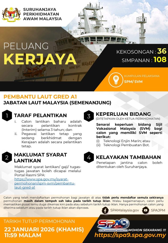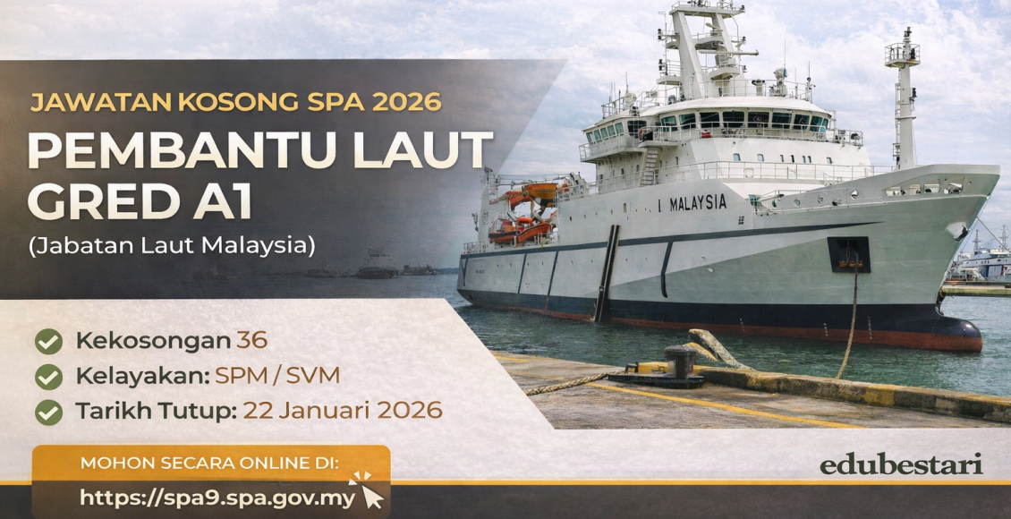 Berita baik kepada lepasan SPM dan SVM, khususnya mereka yang berminat dalam bidang maritim dan teknikal. Suruhanjaya Perkhidmatan Awam Malaysia (SPA) kini membuka permohonan bagi jawatan Pembantu Laut Gred A1 di bawah Jabatan Laut Malaysia (Semenanjung) melalui sistem SPA9.