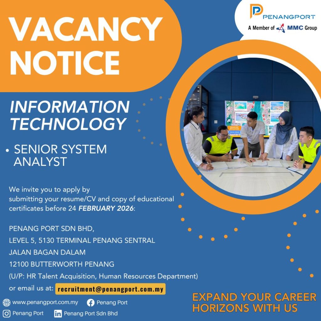 Jawatan kosong di Penang Port Sdn Bhd ini merupakan peluang terbaik untuk membina kerjaya dalam sektor pelabuhan dan logistik negara yang stabil serta berkembang pesat. Dengan penempatan strategik di Pulau Pinang dan status sebagai ahli Kumpulan MMC, peluang ini wajar dipertimbangkan oleh calon profesional IT dan teknikal operasi.