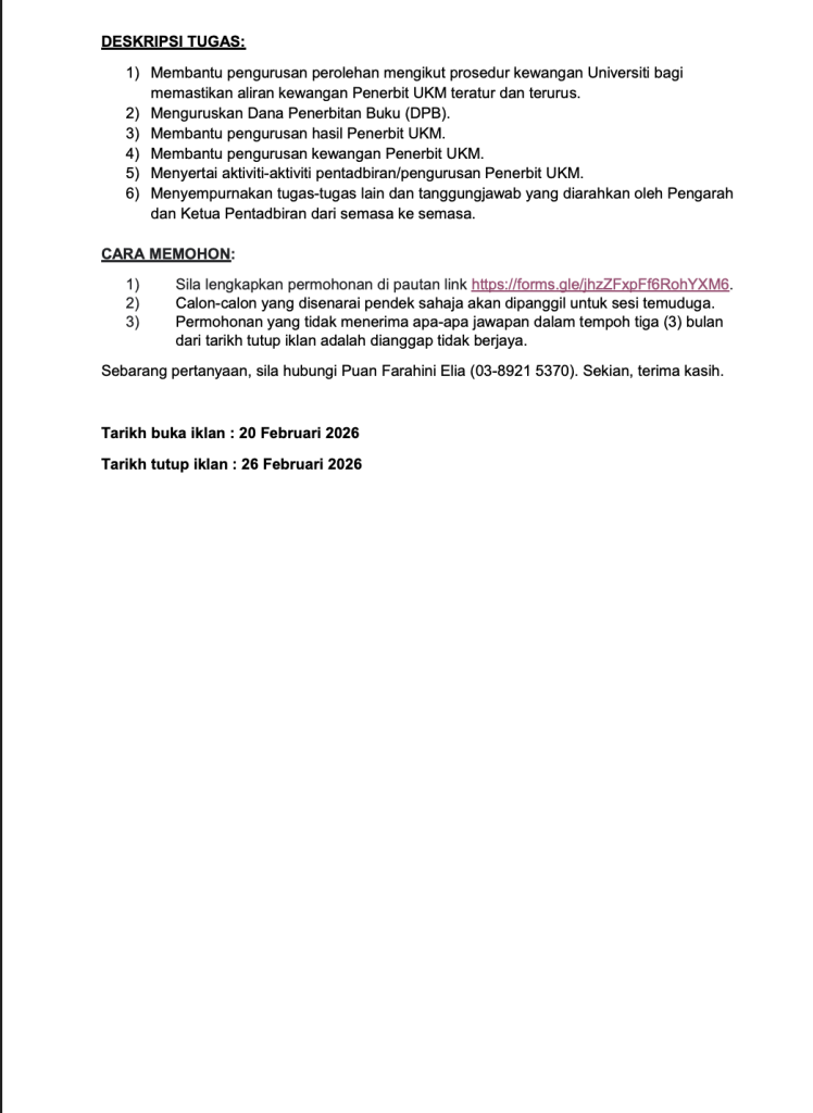 - Tarikh Tutup Permohonan: 26 Februari 2026