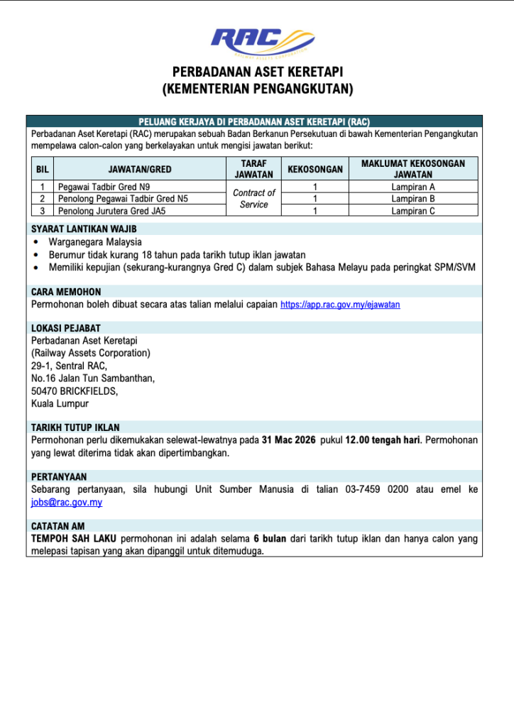 Jawatan kosong Perbadanan Aset Keretapi (RAC) 2026 ini merupakan peluang terbaik untuk calon yang ingin membina kerjaya dalam sektor kerajaan di bawah Kementerian Pengangkutan Malaysia.