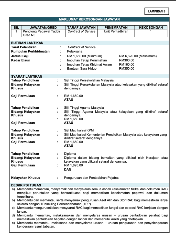 • Penolong Pegawai Tadbir N5: STPM / Diploma