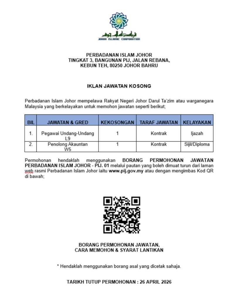 Jawatan Kosong Perbadanan Islam Johor (PIJ) 2026 – 2 Jawatan Dibuka, Tarikh Tutup 26 April