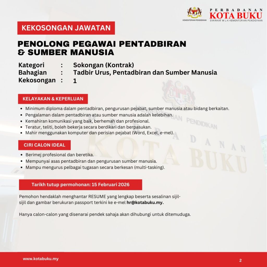 Dengan hormatnya saya merujuk kepada iklan kekosongan jawatan di Perbadanan Kota Buku bagi posisi Penolong Pegawai Pentadbiran & Sumber Manusia.
