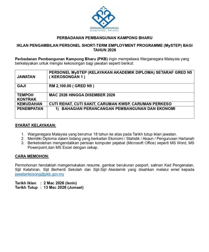 Perbadanan Pembangunan Kampong Bharu (PKB) kini membuka peluang kerjaya di bawah program Short-Term Employment Programme (MySTEP) bagi tahun 2026.