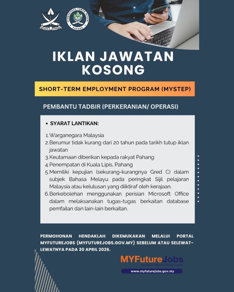 Hebahan ini menawarkan peluang kepada calon berkelayakan untuk memohon jawatan secara kontrak serta melalui program MySTEP. Ia merupakan antara peluang terbaik bagi individu yang ingin mendapatkan pengalaman kerja dalam agensi kerajaan negeri.