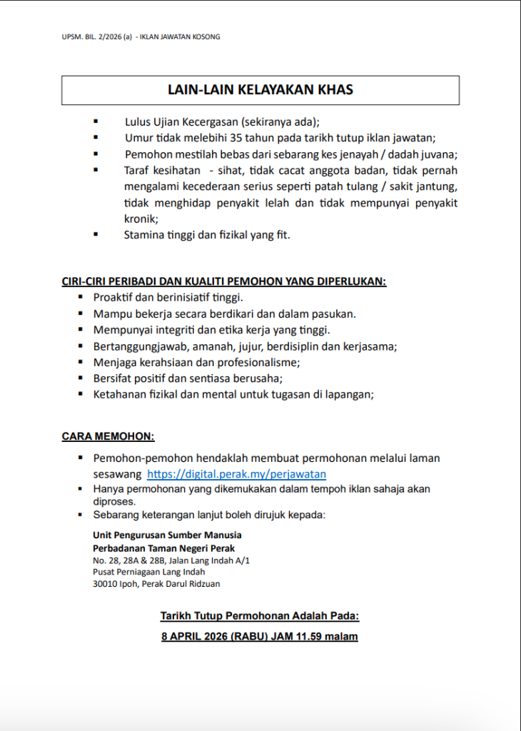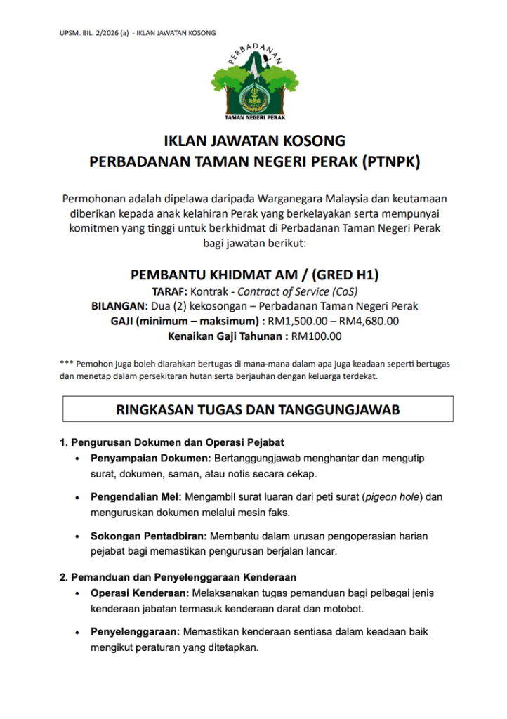 Perbadanan Taman Negeri Perak (PTNPk) kini membuka peluang pekerjaan kepada warganegara Malaysia yang berminat untuk berkhidmat dalam sektor kerajaan negeri. Peluang ini sangat sesuai bagi lepasan SPM yang ingin membina kerjaya dalam bidang operasi, pentadbiran dan kerja lapangan.
