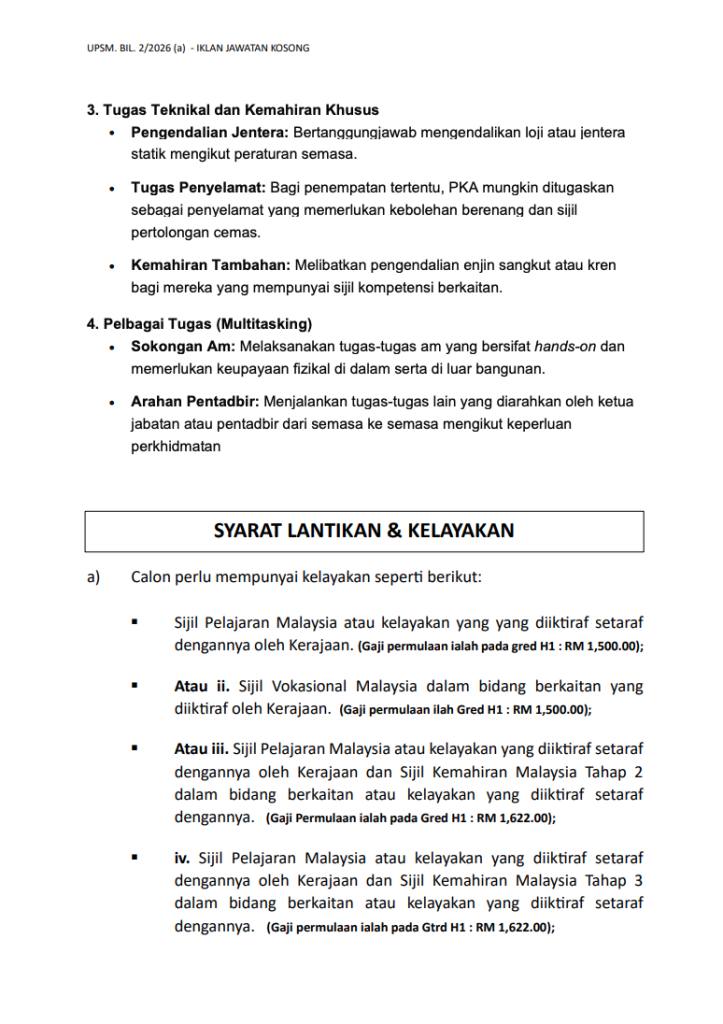 Pengambilan ini melibatkan jawatan Pembantu Khidmat Am Gred H1 dengan taraf lantikan kontrak (Contract of Service). Calon yang mempunyai minat dalam kerja praktikal, fizikal dan berdisiplin tinggi amat digalakkan untuk memohon.