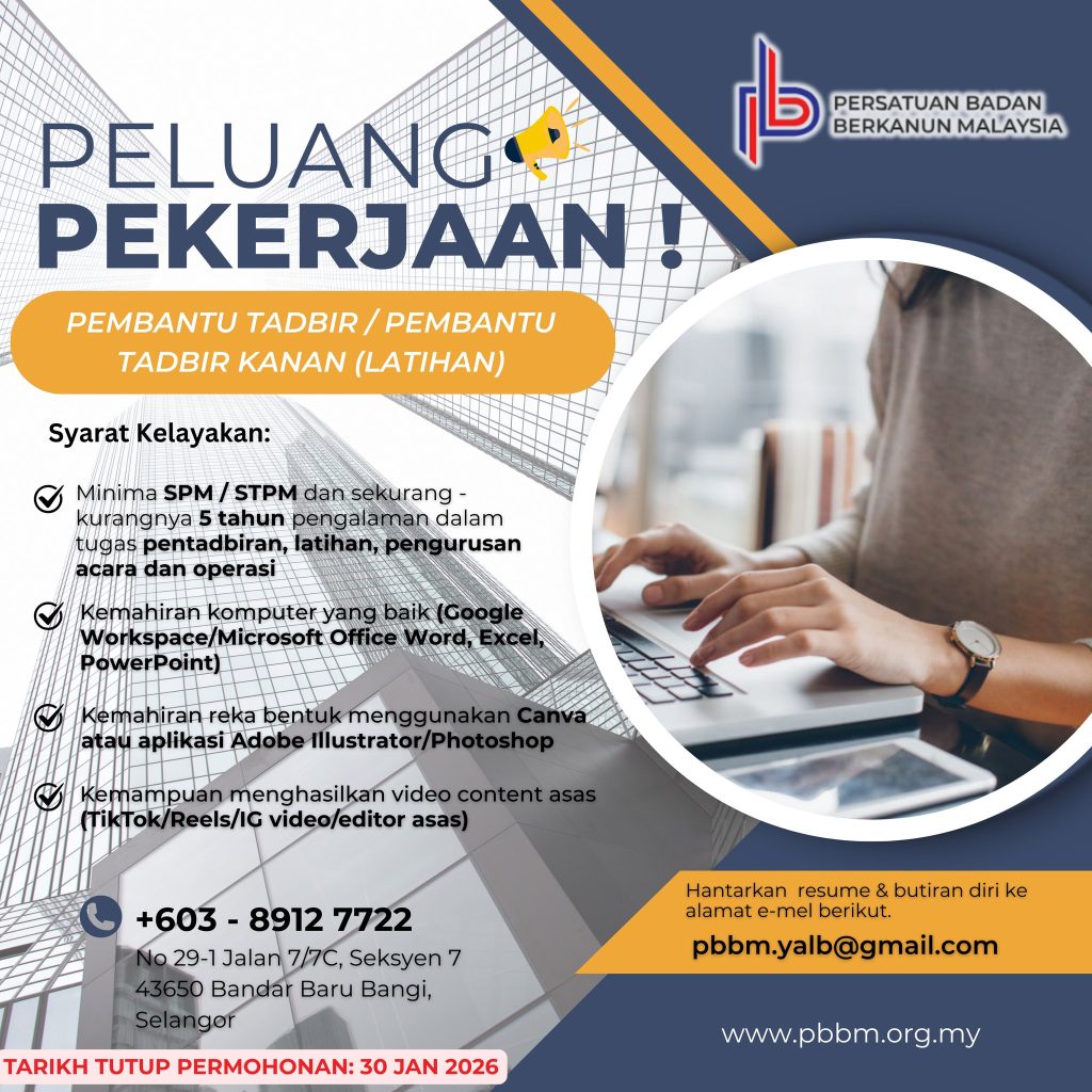 Persatuan Badan Berkanun Malaysia (PBBM) kini membuka peluang pekerjaan bagi mengisi jawatan Pembantu Tadbir / Pembantu Tadbir Kanan (Latihan) di pejabat mereka yang terletak di Bandar Baru Bangi, Selangor.
