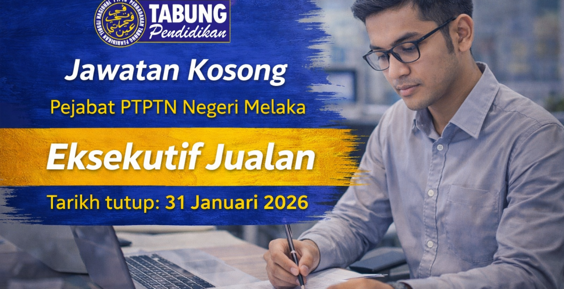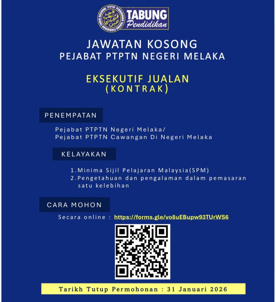 Pejabat PTPTN Negeri Melaka kini membuka peluang pekerjaan secara kontrak bagi jawatan Eksekutif Jualan. Jawatan ini terbuka kepada calon berkelayakan SPM, dengan kelebihan diberikan kepada mereka yang mempunyai pengetahuan atau pengalaman dalam bidang pemasaran.