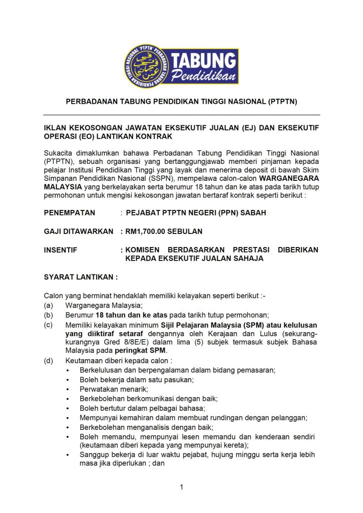 Perbadanan Tabung Pendidikan Tinggi Nasional (PTPTN) kini membuka peluang kerjaya kepada warganegara Malaysia yang berkelayakan untuk mengisi kekosongan jawatan kontrak sebagai Eksekutif Jualan (EJ) dan Eksekutif Operasi (EO) di Pejabat PTPTN Negeri Sabah (PPN Sabah).