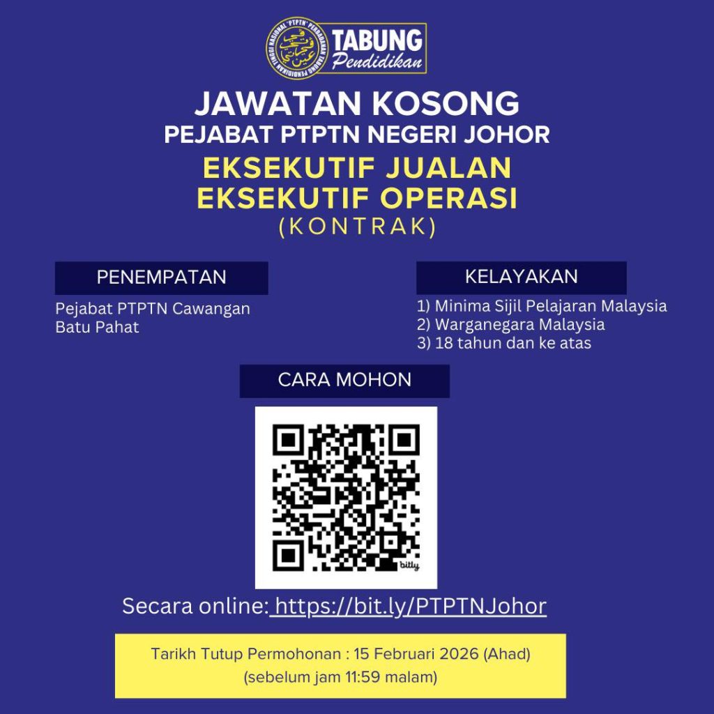 Berita baik kepada pencari kerja khususnya lepasan SPM dan calon awal kerjaya. Perbadanan Tabung Pendidikan Tinggi Nasional (PTPTN) melalui Pejabat PTPTN Negeri Johor kini membuka peluang kerjaya bagi mengisi kekosongan jawatan Eksekutif Jualan dan Eksekutif Operasi secara lantikan kontrak.