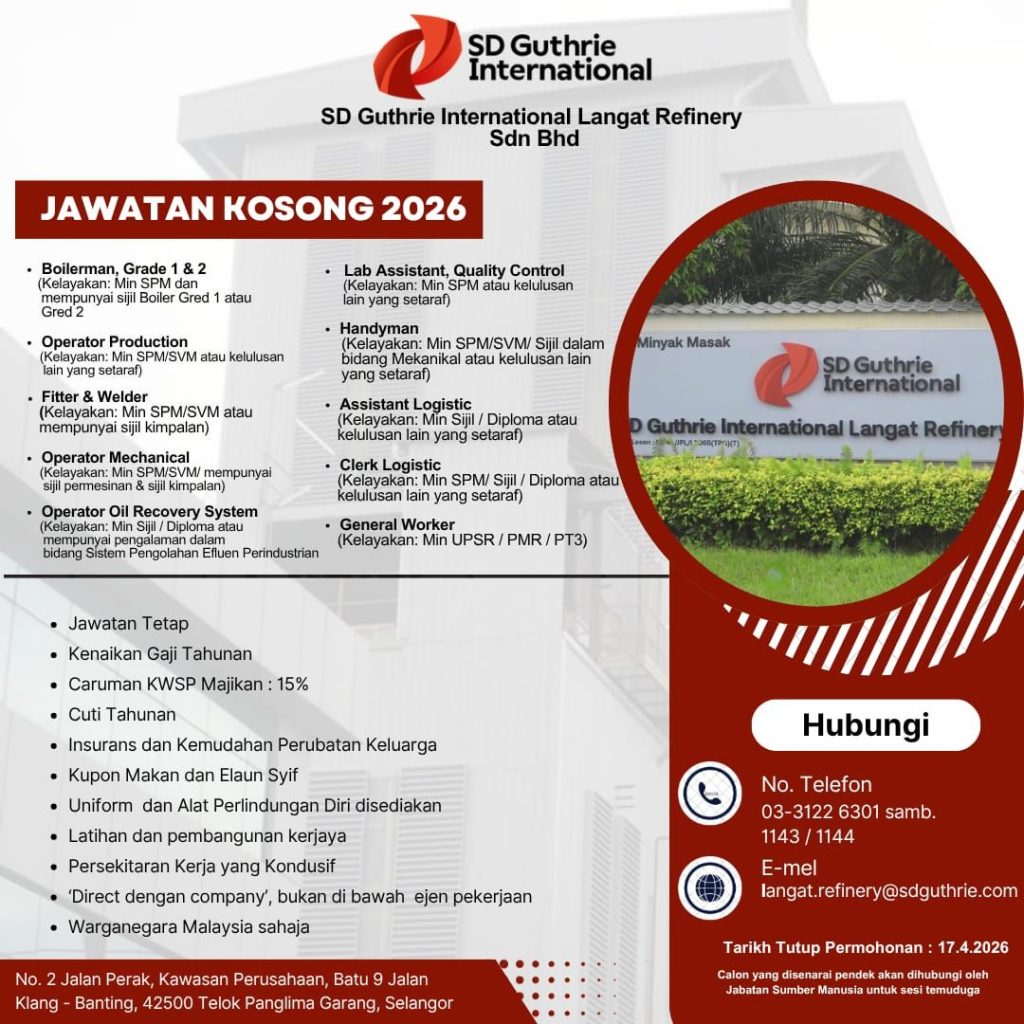 SD Guthrie International Langat Refinery Sdn Bhd kini membuka pengambilan bagi tahun 2026 melibatkan pelbagai jawatan.