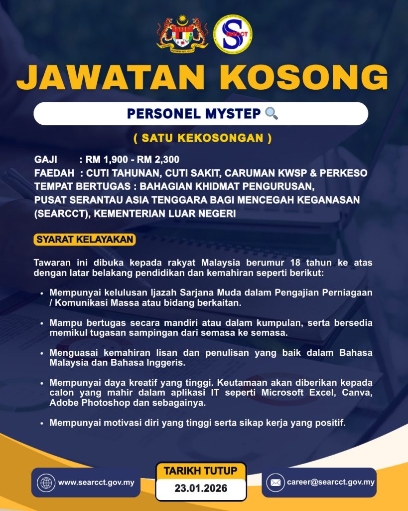 Pusat Serantau Asia Tenggara bagi Mencegah Keganasan (SEARCCT) di bawah Kementerian Luar Negeri Malaysia kini membuka peluang kerjaya Personel MySTEP kepada warganegara Malaysia yang berkelayakan. Peluang ini sesuai untuk graduan yang mempunyai latar belakang komunikasi, perniagaan serta kemahiran digital dan kreatif.