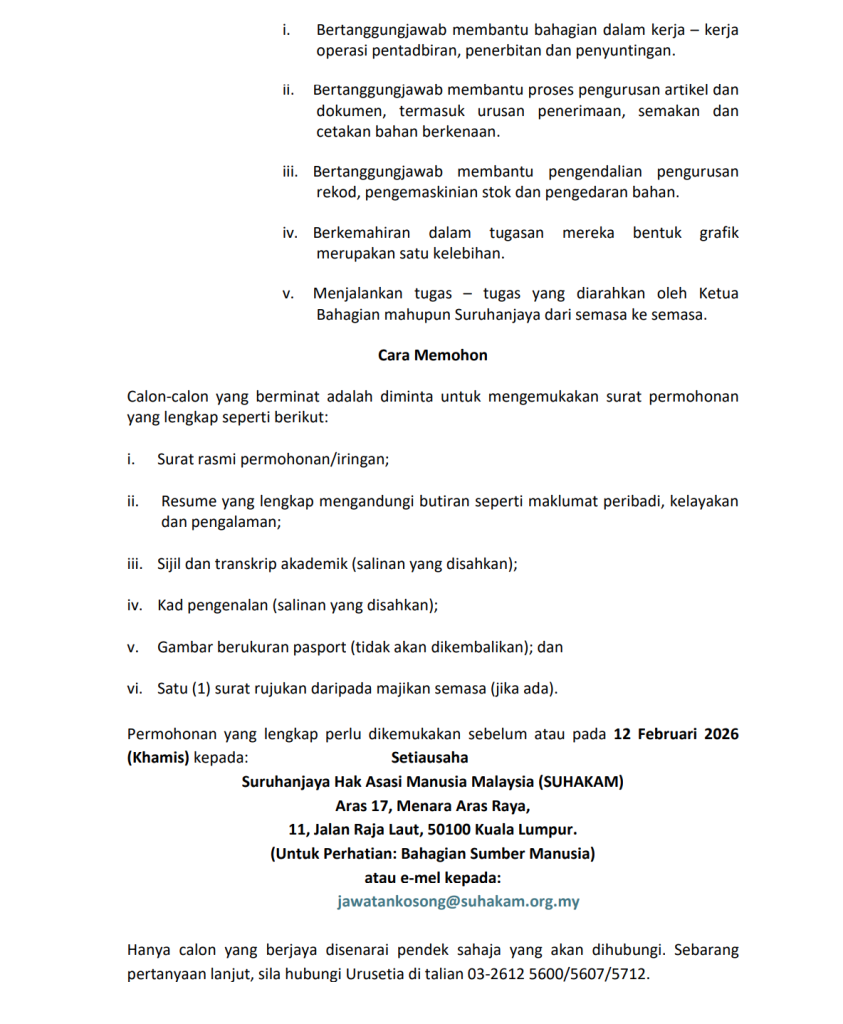- Emel ke: jawatankosong@suhakam.org.my