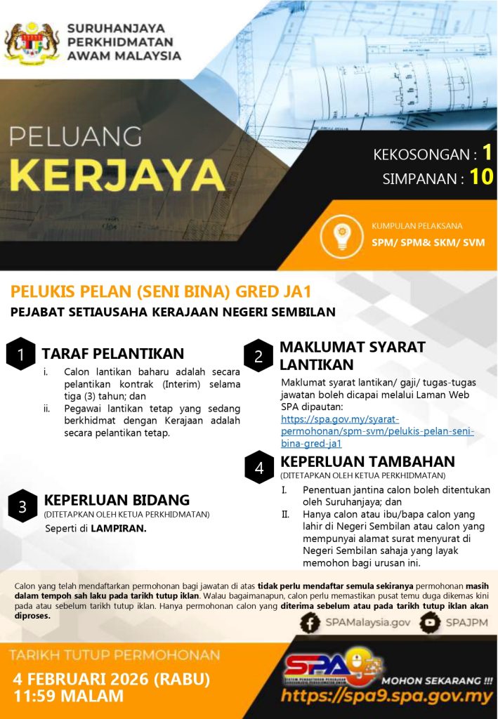 Jawatan Kosong SPA 2026: Pelukis Pelan (Seni Bina) Gred JA1 SUK Negeri Sembilan