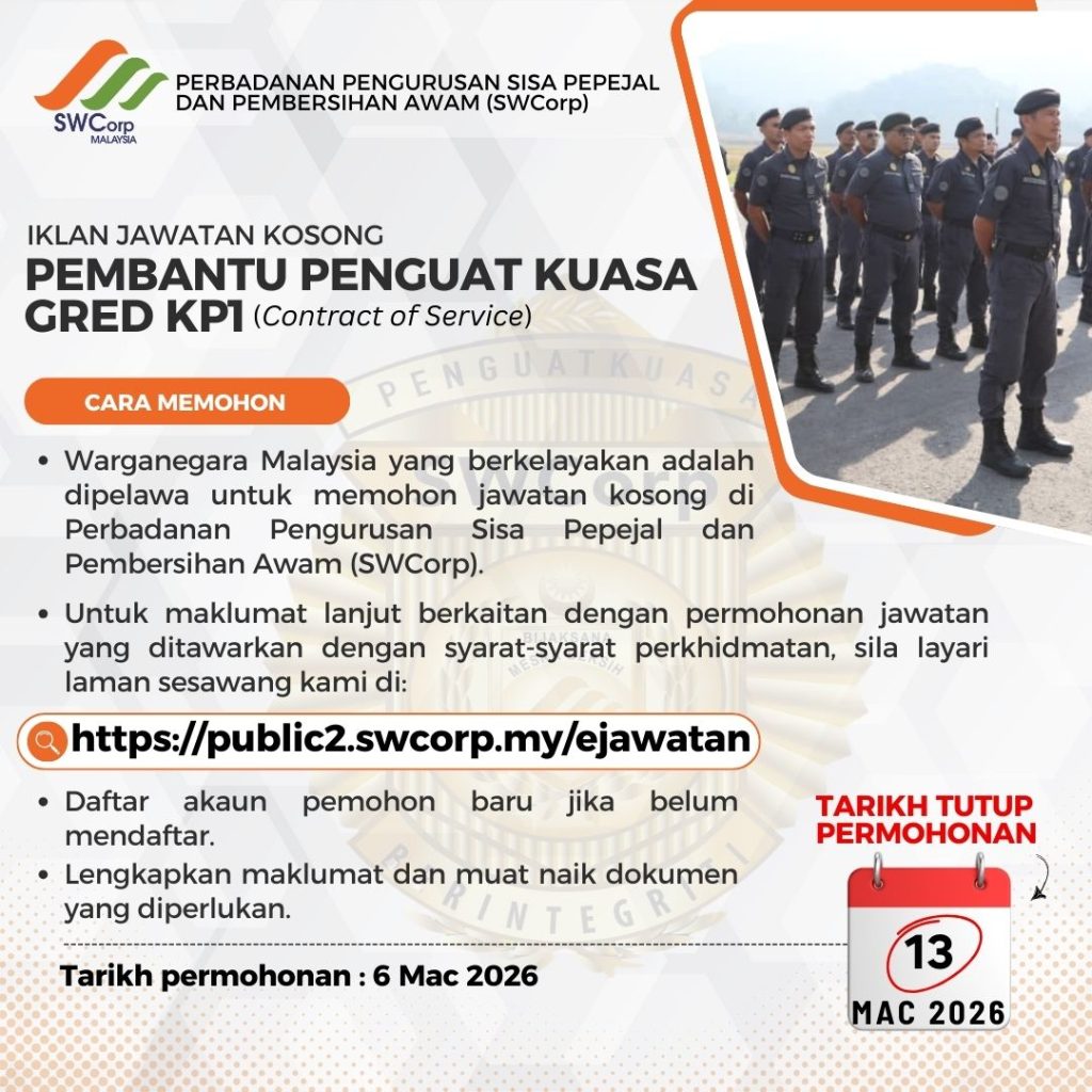Perbadanan Pengurusan Sisa Pepejal dan Pembersihan Awam (SWCorp) kini membuka peluang kerjaya kepada warganegara Malaysia yang berkelayakan untuk menyertai pasukan penguatkuasaan mereka. Pengambilan ini melibatkan jawatan Pembantu Penguat Kuasa Gred KP1 secara lantikan Contract of Service.
