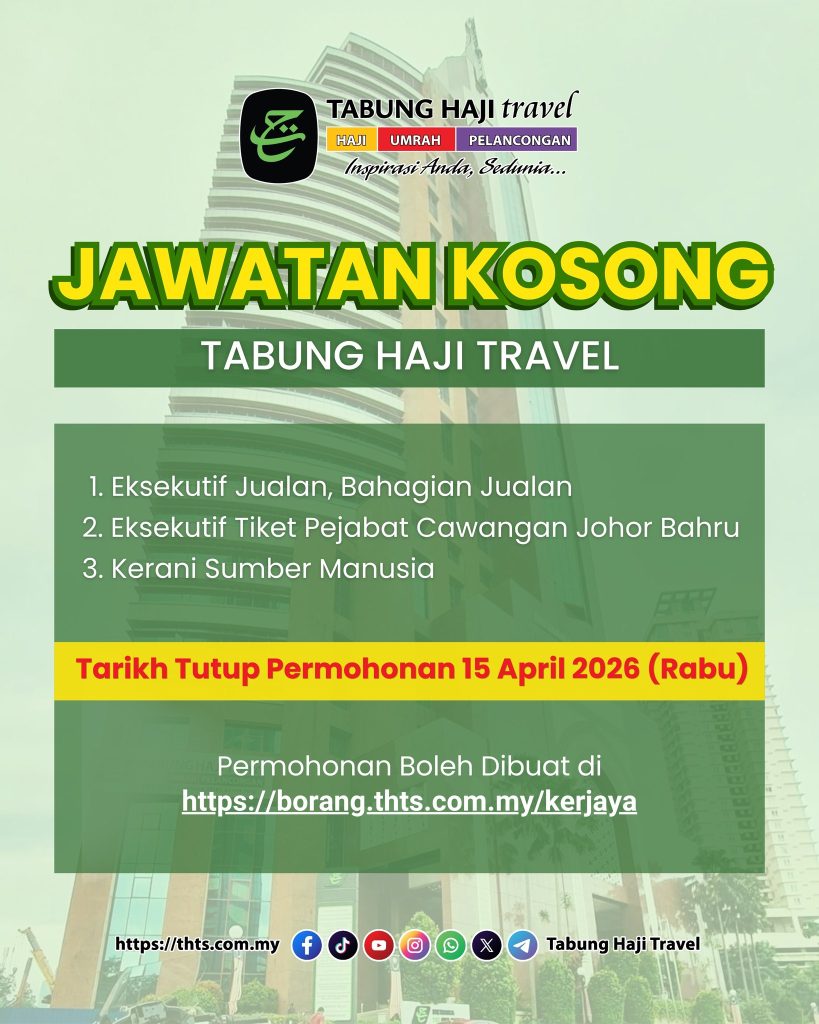 Tabung Haji Travel & Services (THTS) kini membuka beberapa jawatan termasuk Eksekutif Jualan, Eksekutif Tiket dan Kerani Sumber Manusia. Permohonan dibuat secara online dan tarikh tutup adalah 15 April 2026 (Rabu).
