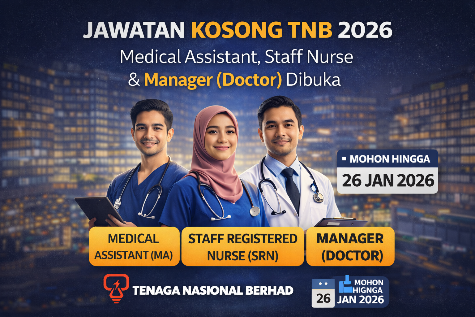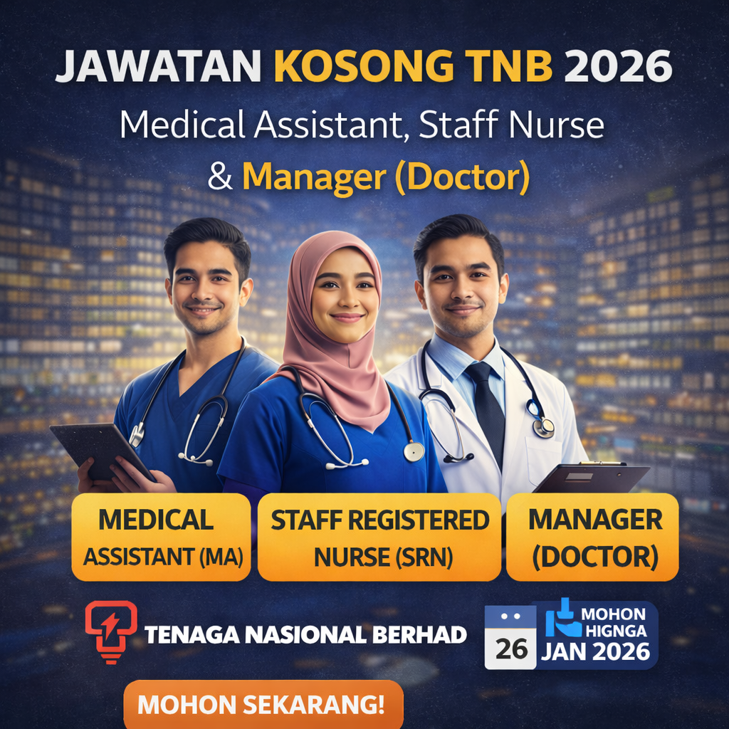 TNB kini membuka beberapa peluang kerjaya dalam bidang perubatan dan kesihatan untuk tahun 2026. Kekosongan ini melibatkan jawatan Medical Assistant (MA), Staff Registered Nurse (SRN) serta jawatan peringkat pengurusan iaitu Manager (Doctor) di beberapa lokasi strategik di Malaysia.