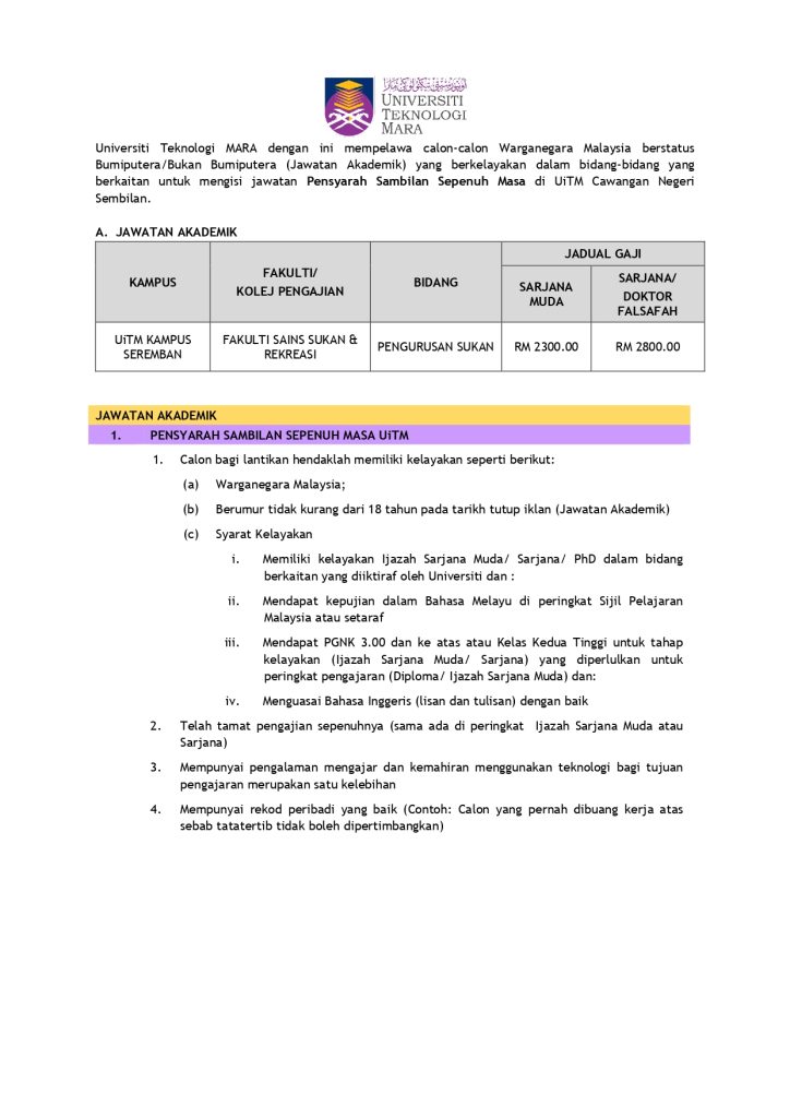 Jawatan Pensyarah Sambilan Sepenuh Masa UiTM Cawangan Negeri Sembilan merupakan peluang terbaik untuk graduan Sarjana dan PhD yang ingin membina pengalaman akademik di universiti awam. Dengan gaji kompetitif, tempoh lantikan jelas dan persekitaran akademik profesional, jawatan ini sangat sesuai sebagai langkah strategik dalam kerjaya pensyarahan.