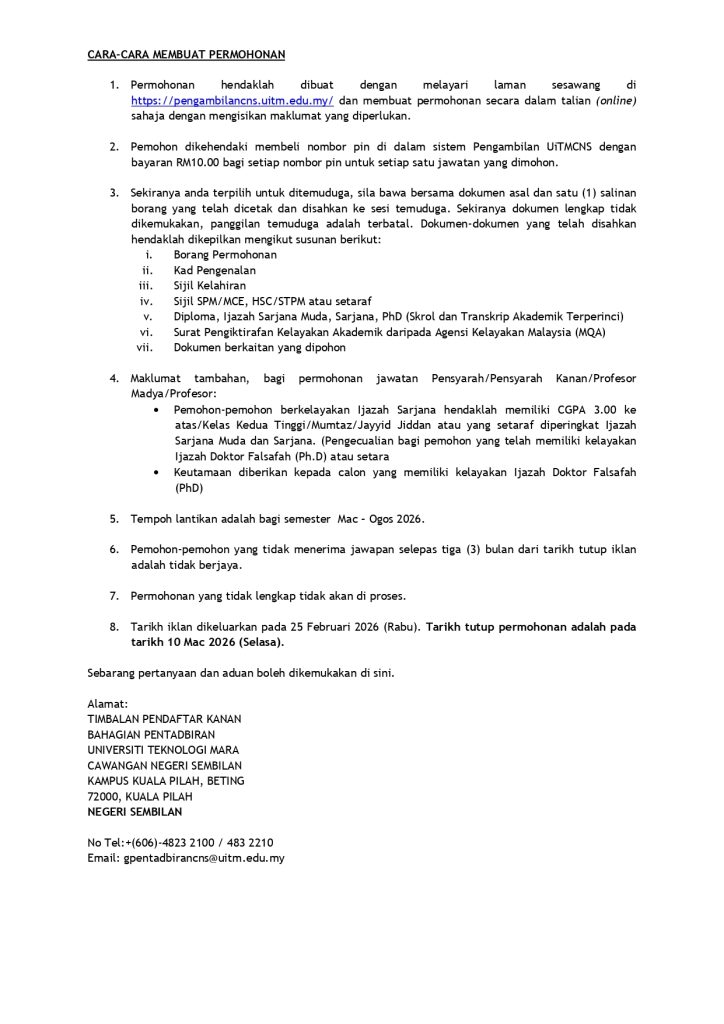 (Sila rujuk laman e-Pengambilan UiTM Cawangan Negeri Sembilan)