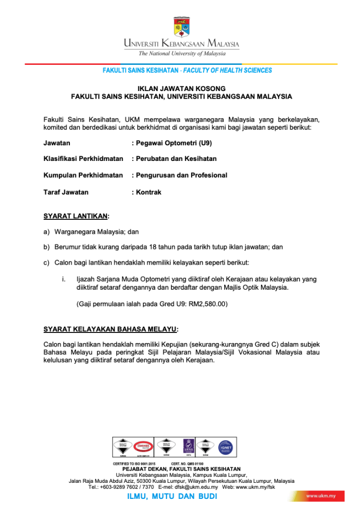 Fakulti Sains Kesihatan, Universiti Kebangsaan Malaysia (UKM) membuka peluang kerjaya kepada warganegara Malaysia yang berkelayakan untuk mengisi jawatan Pegawai Optometri Gred U9 secara lantikan kontrak. Peluang ini sangat sesuai untuk graduan Optometri yang ingin membina pengalaman profesional dalam persekitaran universiti awam berprestij.