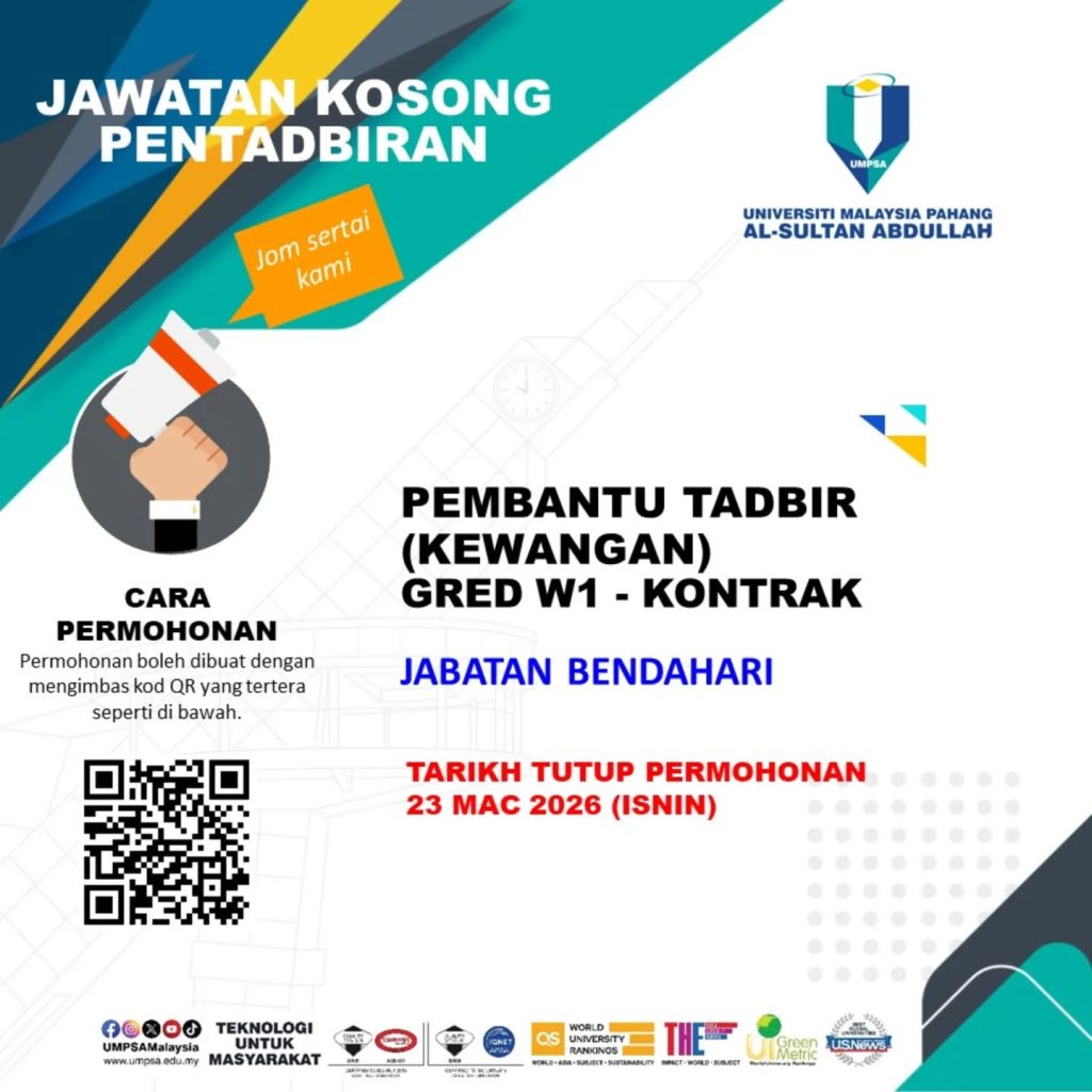Pengambilan ini melibatkan jawatan Pembantu Tadbir (Kewangan) Gred W1 di bawah Jabatan Bendahari UMPSA. Jawatan ini dibuka secara kontrak bagi membantu pengurusan pentadbiran kewangan universiti.