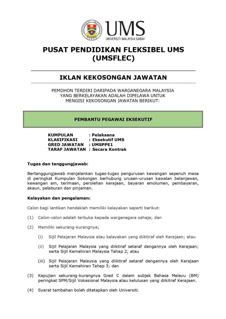 Pusat Pendidikan Fleksibel Universiti Malaysia Sabah (UMSFLEC) kini membuka peluang kepada warganegara Malaysia yang berkelayakan untuk mengisi kekosongan jawatan Pembantu Pegawai Eksekutif secara kontrak.