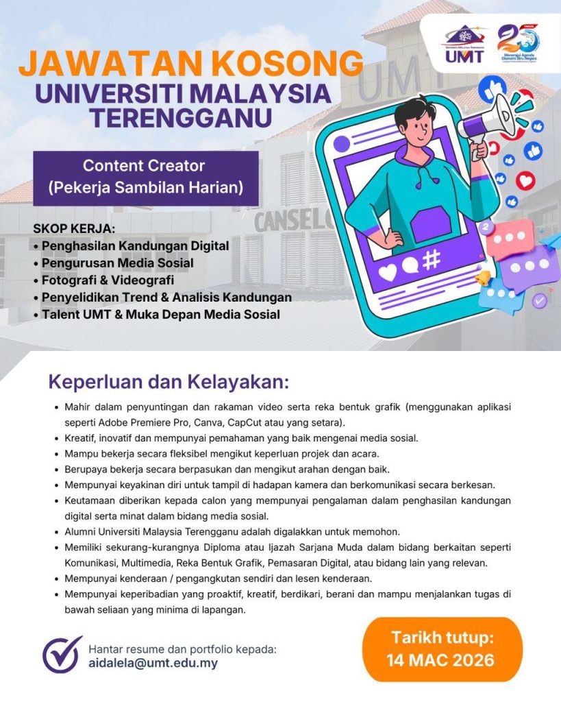 Universiti Malaysia Terengganu (UMT) kini membuka peluang kerjaya kepada individu yang kreatif dan berkemahiran dalam bidang media digital untuk mengisi kekosongan jawatan Content Creator secara Pekerja Sambilan Harian (PSH).