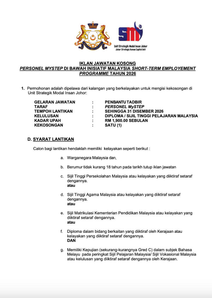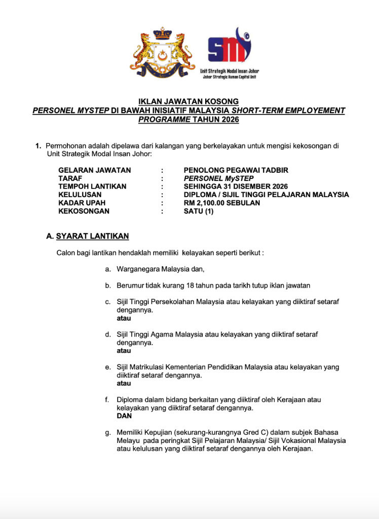 Peluang kerjaya dalam sektor kerajaan negeri terus menjadi pilihan utama dalam kalangan graduan dan pencari kerja di Malaysia. Kini, melalui inisiatif Malaysia Short-Term Employment Programme (MySTEP) 2026, Unit Strategik Modal Insan Johor membuka peluang kepada calon berkelayakan untuk menyertai sektor awam.