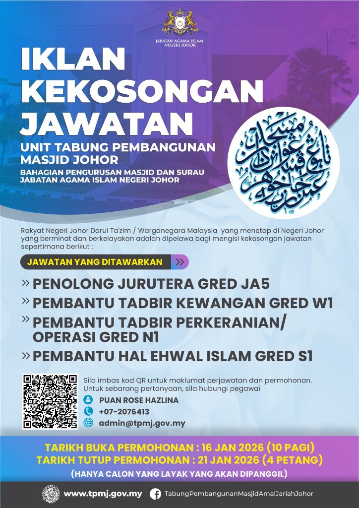Unit Tabung Pembangunan Masjid Johor (TPMJ) di bawah Bahagian Pengurusan Masjid dan Surau, Jabatan Agama Islam Negeri Johor (JAINJ) kini membuka iklan kekosongan jawatan kontrak bagi tahun 2026.