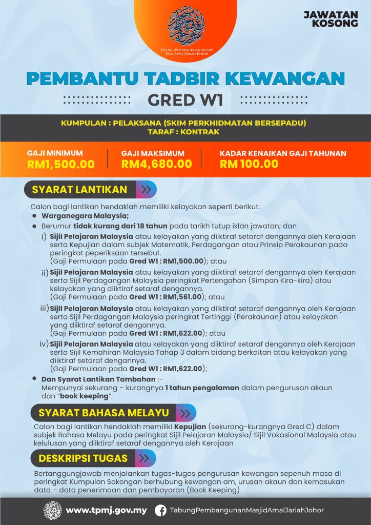Jika anda mempunyai kelayakan dan pengalaman yang bersesuaian, inilah masa terbaik untuk memohon. Jawatan di bawah TPMJ bukan sahaja menawarkan peluang pekerjaan, malah membuka ruang untuk menyumbang secara langsung kepada pembangunan masjid dan masyarakat Islam di Negeri Johor.