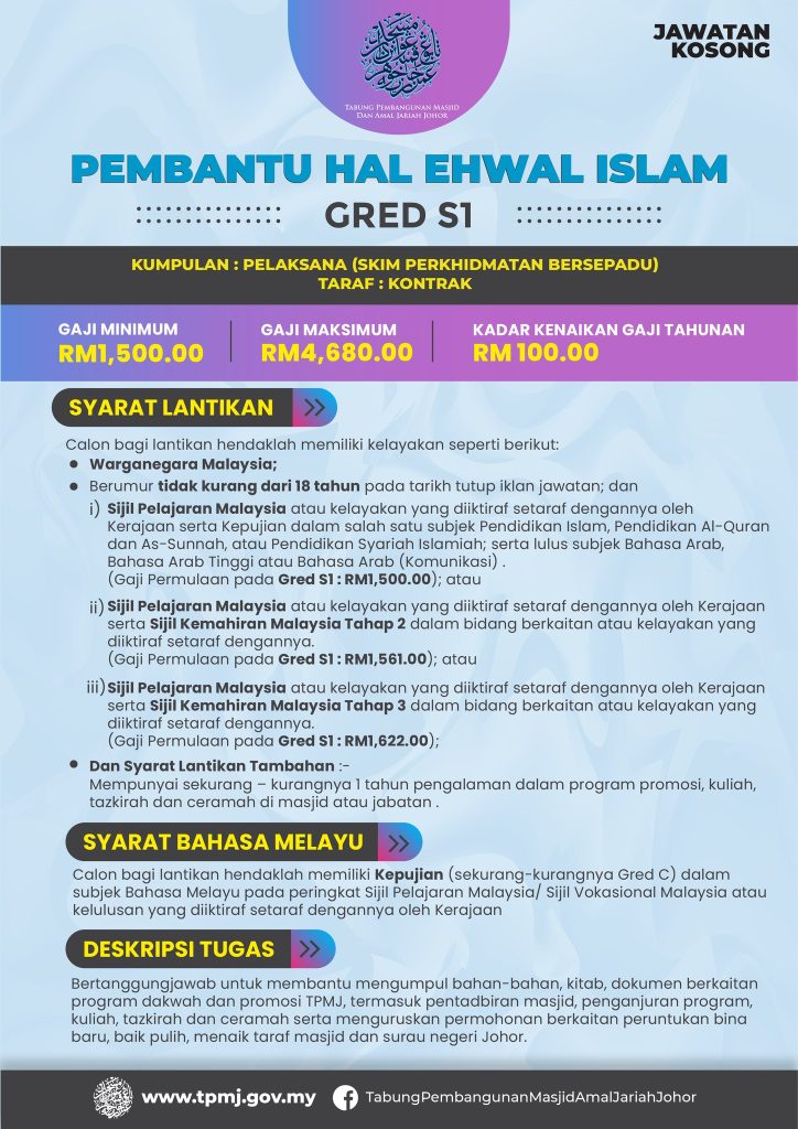 - Majikan: Unit Tabung Pembangunan Masjid Johor (TPMJ)
